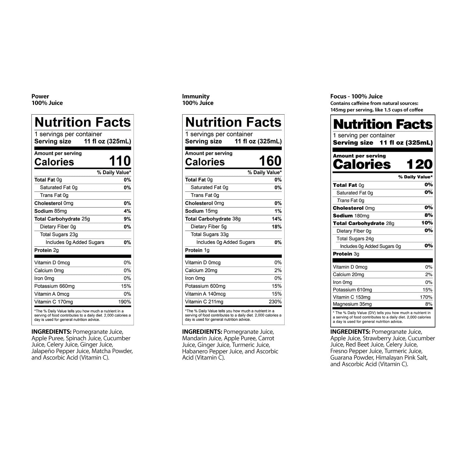 Ingredients: Pomegranate Juice, Apple Puree, Spinach Juice, Cucumber Juice, Celery Juice, Ginger Juice, Jalapeño Pepper Juice, Matcha Powder, and Ascorbic Acid (Vitamin C).