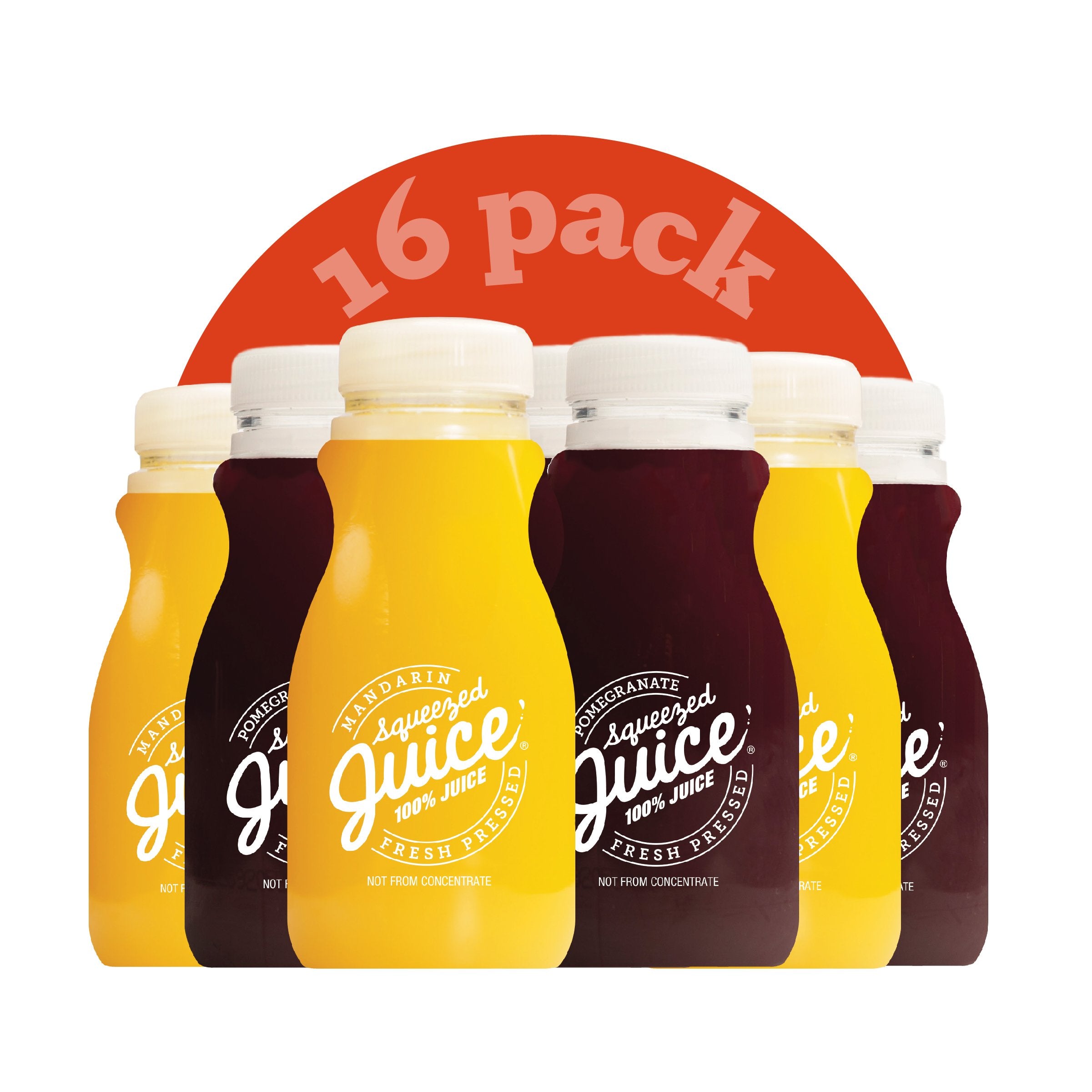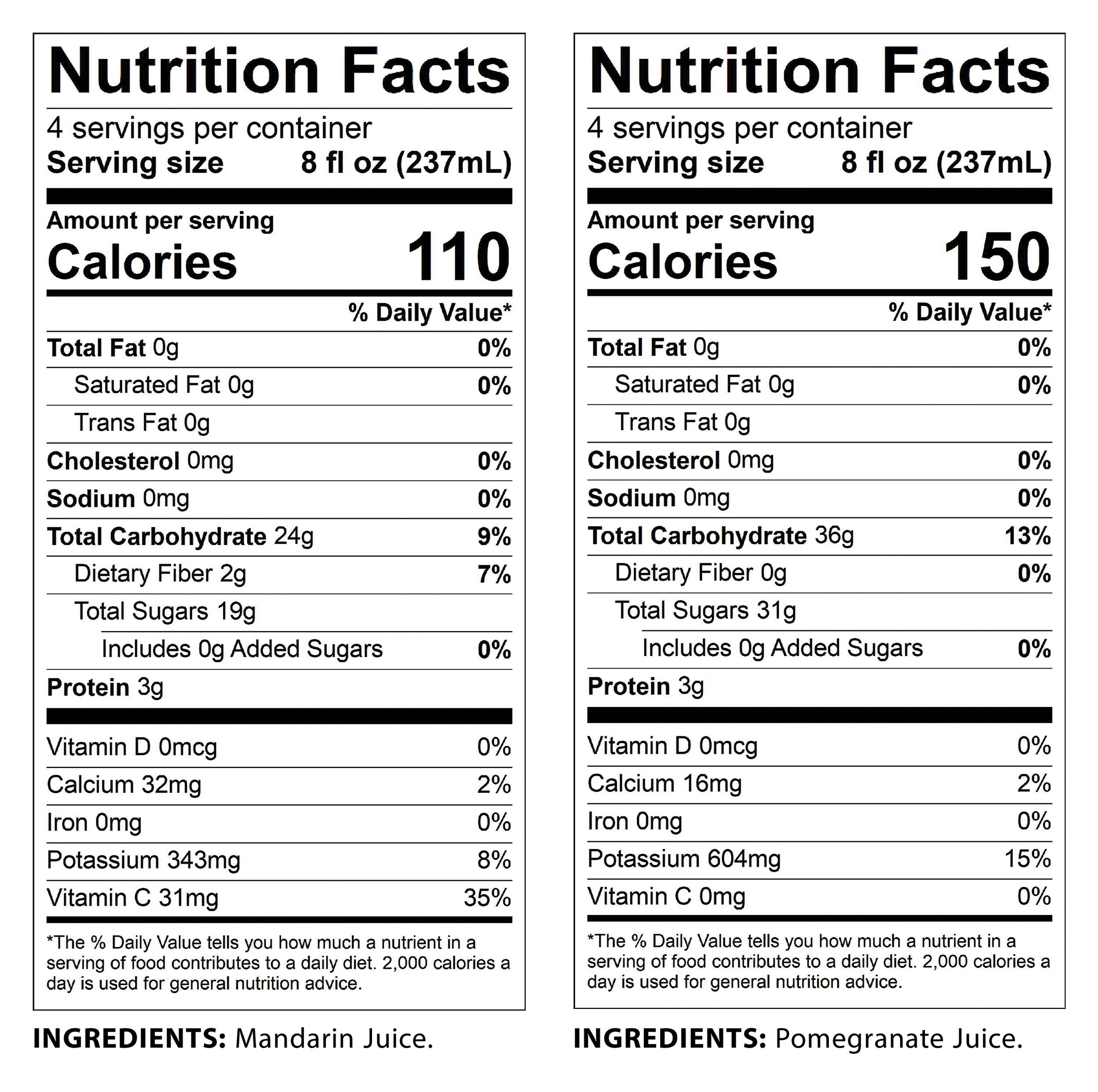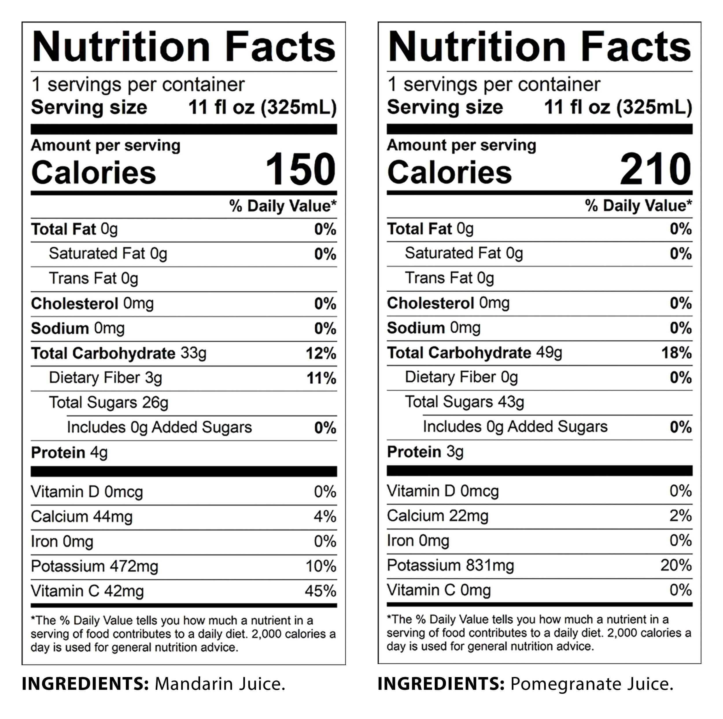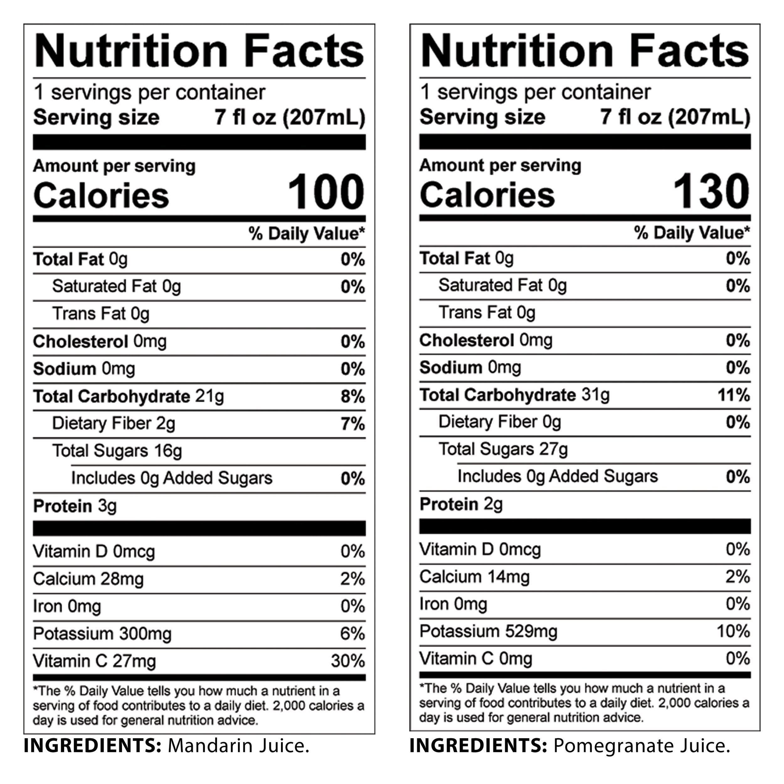 100% Mandarin Juice & 100% Pomegranate Juice – 50/50 Product split per box. 6/12/16 total bottles per case.