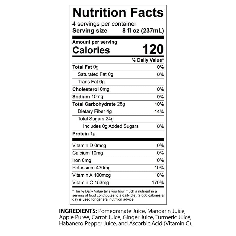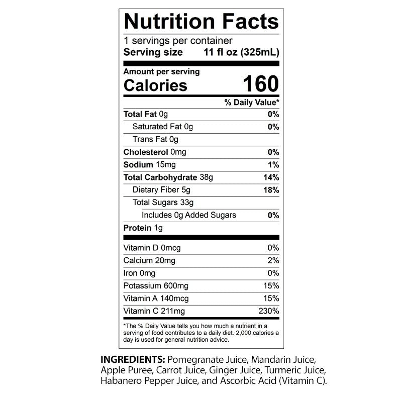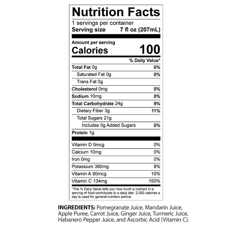Ingredients: Pomegranate Juice, Mandarin Juice, Apple Puree, Carrot Juice, Ginger Juice, Turmeric Juice, Habanero Pepper Juice, and Ascorbic Acid (Vitamin C).